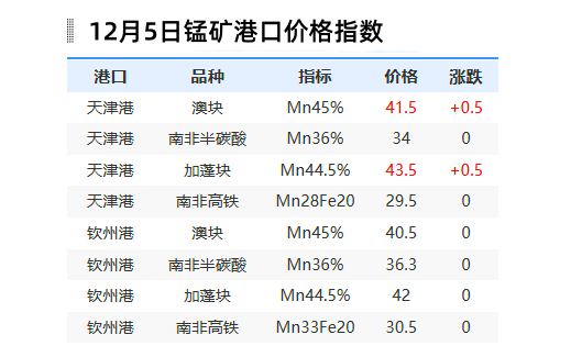 价格上,天津港半碳酸主流报价34.5元/吨度,成交34.2-34.3元/吨度,南非高铁分指标成交29.5-30元/吨度不等,加蓬43元/吨度,报价43.5-44元/吨度,澳块分指标报价42-44元/吨度区间。钦州港锰矿价格整体盘整震荡,高品块矿价格坚挺,澳块分指标价格40.5-42.5元/吨度,半碳酸价格36-36.5元/吨度,南非高铁价格30.5元/吨度,澳籽分指标35.5-36.5元/吨度不等。